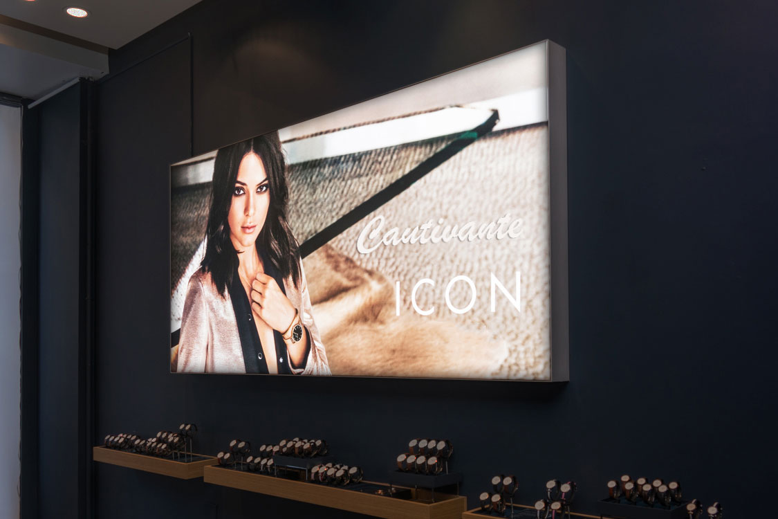 Proyectar hacia el exterior la imagen impresa que contiene mientras que de la parte posterior permite ver desde el cristal sobre el que se ha colocado.